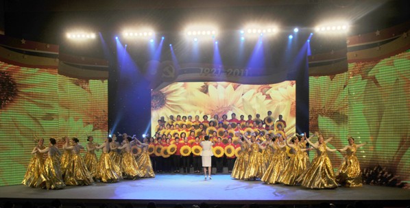 本次大会活动将庆祝和表彰用歌舞等艺术形式予以表达,紧密融合在一起。大会开场首先在学会副理事长兼秘书长李少丽指挥下,国家局离退休干部局合唱团演唱《阳光路上》,学会职工配以欢快舞蹈表演下拉开帷幕,整体歌舞烘托了大会开场的喜庆气氛。国家局党组书记、局长邵明立在开场歌舞表演后发表了热情洋溢的讲话。会上,在表彰优秀共产党员、优秀党务工作者和先进基层党组织之中,穿插由国家局及直属单位干部职工演唱的一曲曲耳熟能详的红歌联唱,学会全体干部职工又以歌舞表演《军民团结一家亲》为庆祝表彰大会增添了亮丽的风景线。最后,庆祝大会在李少丽副理事长兼秘书长激情指挥下,全场人员共唱一曲士气高昂《我们走在大路上》的大合唱中圆满结束。