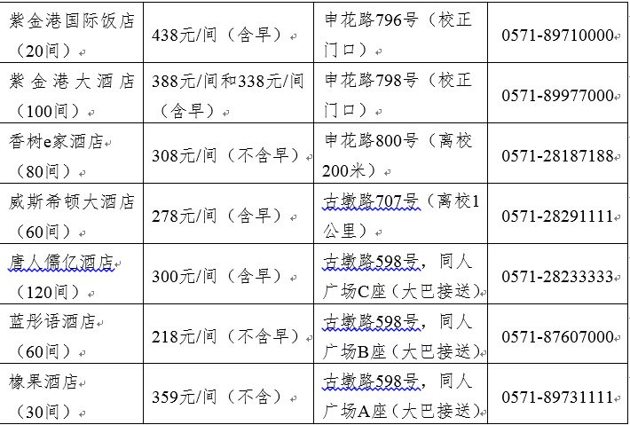 一是在紫金港国际饭店(申花路796号,0571-89710000。选择紫金港国际饭店、紫金港大酒店、香树e家酒店、威斯希顿大酒店等4家酒店的代表,注册地在紫金港国际饭店);