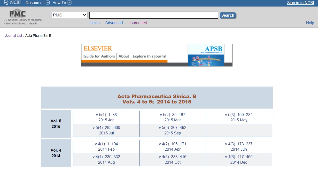 PMC目前已收录全文论文370万篇,所有全文在PubMed中都可以检索,检索结果可以在网上免费获得全文。目前共收录期刊5549种,其中完整收录的期刊1767种, NIH资助论文的期刊317种,提供选择性论文的期刊3465种。《药学学报》英文刊属于完整收录的期刊。