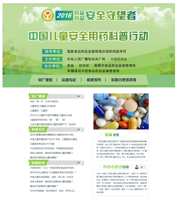 “中国儿童安全用药科普行动”是2016年“食品药品安全守望者”宣传活动系列之一,也是2016年“全国安全用药月”的一个重要组成部分。本次活动旨在搭建国家级权威科普传播平台,将药品安全守望者,尤其是儿童药品安全守望者的正确理念、经验知识和正能量及时传达,并通过搭建网络科普平台、儿童用药知识校园巡展、安全用药小天使招募、专家主题讨论等多种科普宣教的方式,积极倡导社会参与,促进中国儿童用药安全有效。启动仪式上宣布“中国儿童安全用药科普栏目”正式上线。