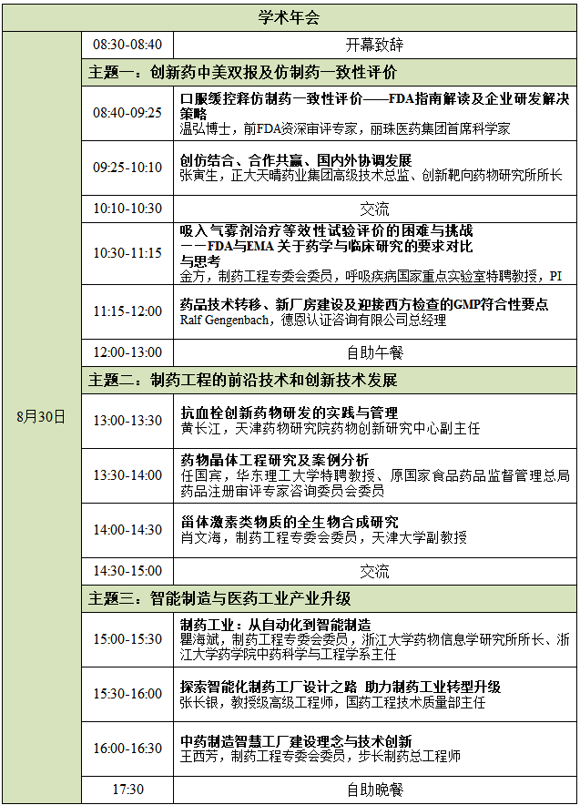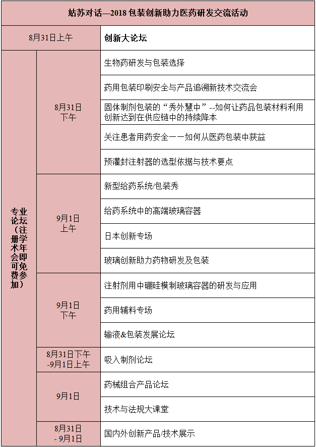 会议时间:2018年8月29日报到,8月30日举办制药工程专业委员会学术年会,8月31-9月1日开展“姑苏对话—2018 包装创新助力医药研发交流活动”。
