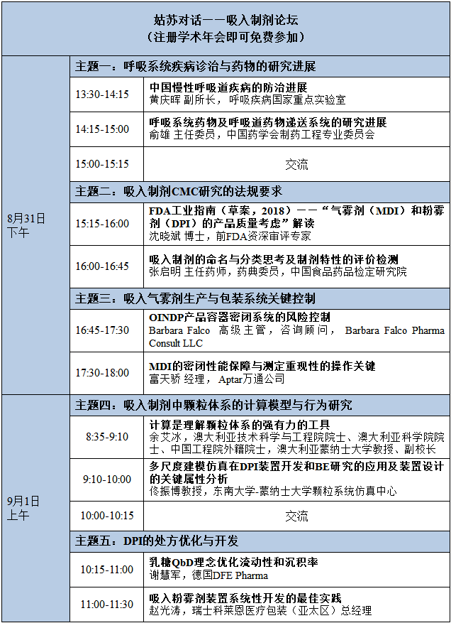 本次会议将联合由中国医药包装协会主办的“姑苏对话—2018 包装创新助力医药研发交流活动”举办。该活动设置一个创新大论坛和包括“吸入制剂论坛”(由制药工程专委会、呼吸疾病国家重点实验室和包材协会共同主办)在内的20余个专题分论坛,将学术会议和创新技术/产品展示相结合,邀请到国内外资深专家学者与业内同仁共同研讨制药工业界的热点话题。特诚邀制药工程及相关领域审评专家、知名学者、国内外制药企业资深研发人员以及医药从业人员参会。